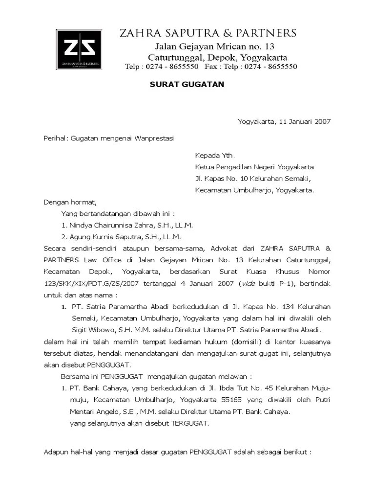 Format surat gugatan perdata wanprestasi meski surat gugatan tidak memiliki format baku sebagai syarat formil namun dalam praktek telah menjadi standar umum bahwa gugatan itu perlu diajukan dalam format tertentu. Simpan simpan format surat gugatan wanprestasi untuk nanti 83% 83% menganggap dokumen ini bermanfaat, tandai dokumen ini sebagai bermanfaat 17% 17% menganggap dokumen ini tidak bermanfaat, tandai dokumen ini sebagai tidak bermanfaat Bahwa, dengan tidak dilaksanakannya kewajiban tergugat tersebut, maka tergugat telah melakukan ingkar janji (wanprestasi) terhadap perjanjian, yaitu dengan tidak dilaksanakannya pembayaran pertama kali honorarium sebesar rp. Gandi husodo sh mh dan lidya desnia ida masta sh mh advokat pengacara dan … Kenapa gugatan wanprestasi dan perbuatan melawan hukum sering dicampuradukan.